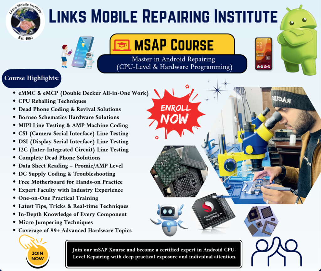 Are you ready to join the top 1% of mobile technicians? The mobile repairing industry is evolving, and basic repairs are no longer enough to survive. To truly lead the market, you must master the heart of the device. Our MSAP Course (Master in Advanced Programming & Android Repairing) is an elite-level training program specifically designed for those who want to achieve total command over CPU-Level repairs and Deep Hardware Programming. MSAP is not just a training module; it is a complete transformation. We bridge the gap between a standard technician and a Hardware Engineer. This course focuses on the most complex part of a smartphone—the Motherboard and its Processing Unit. We take you deep into the world of micro-architecture, teaching you the precise logic required to diagnose and fix issues that 90% of shops turn away.
